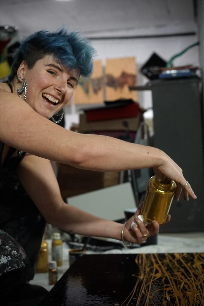 I’ve exhibited across the UK and am now building my practice here in Spain, making work that doesn’t quite fit the ‘fine art’ box – and I’m perfectly happy about that. I paint with industrial materials, add generous amounts of glitter and gold leaf, and yes, sometimes incorporate dead insects. The result? Bold, joyful pieces that tend to catch people off guard in the best way.
