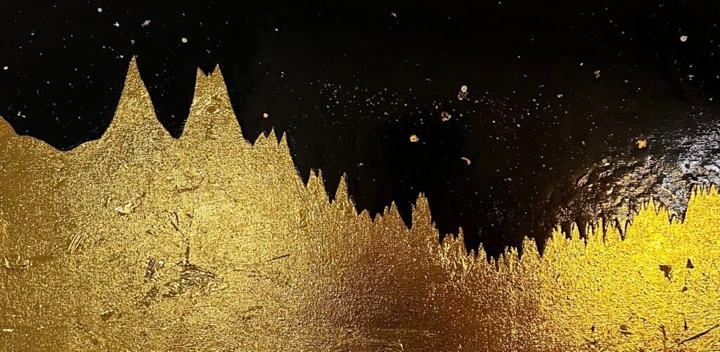 I decided to use emotive materials in this piece – gold leaf, which is an old favourite. For texture, I collected sand from a beach that has been a significant part of my life.