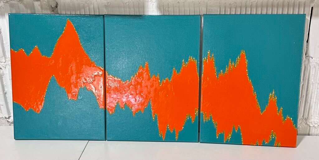I’ve always found inspiration in unexpected places. The first spark of inspiration for this series came one night, whilst listening to the sound of my husband’s snoring. I pondered whether it would be possible to paint a sound. Not long after, I discovered the means of capturing the ‘waveform’ of specific sounds. And so ‘Whilst I Lay Sleeping’ was born, followed by this series of soundscapes. Each one with a different meaning to me and a variety of materials inspired byt he sounds thatt they are based upon.